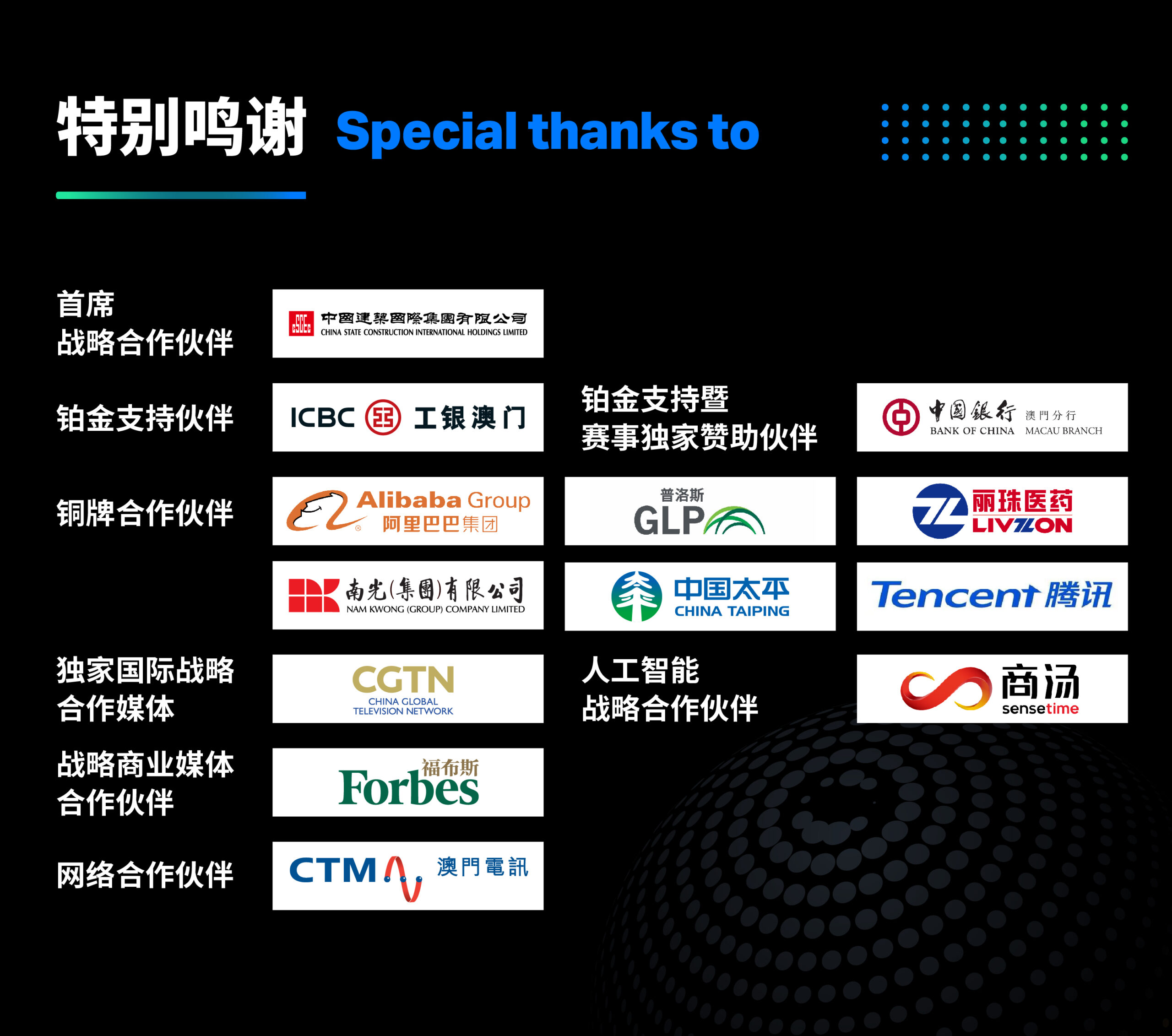 ■ 承认参展企业代表:阿里巴巴、澳门电讯、澳门中银、德勤、复星集团、工银澳门、光控母基金、海康威视、恒健控股、华大基因、华为、华西医院、极米科技、丽珠医药、南光集团、商汤科技、腾讯集团、小鹏汇天、亿航、正泰集团、我国电信、我国建材集团、我国修建世界、我国石化、我国和平、中铁建、我国土木工程(澳门)有限公司、中邮器件等