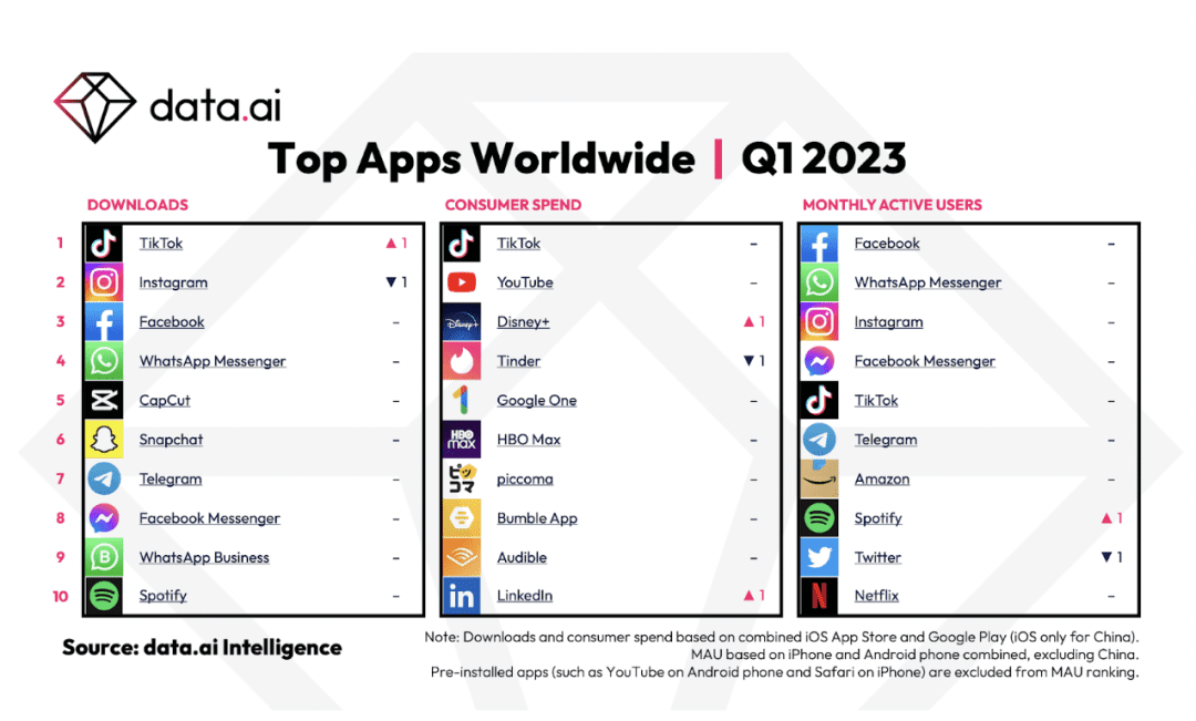 最值得注意的是,TikTok 的排名上升了一位,替代了 Instagram,成为世界上下载次数最多的使用程序。