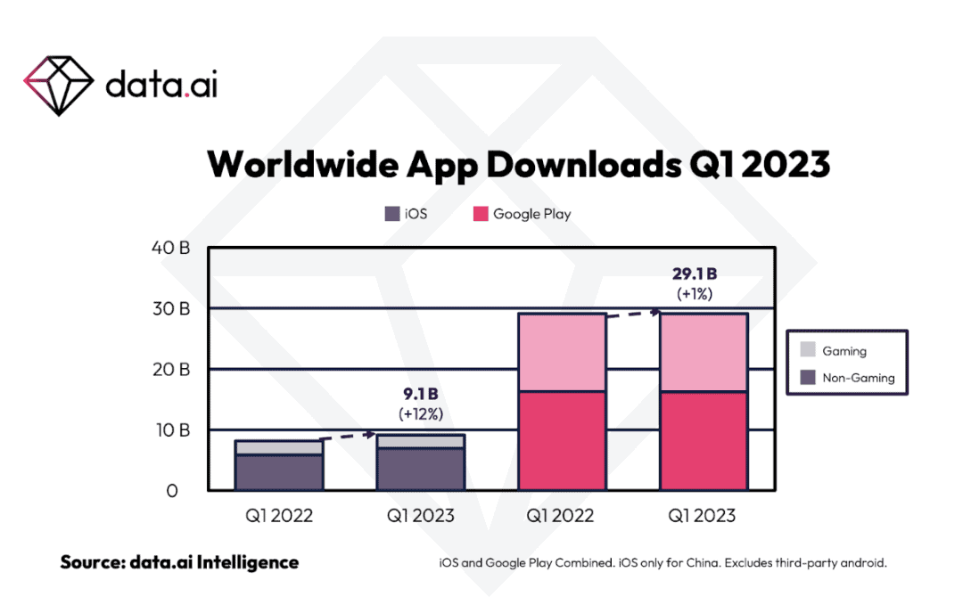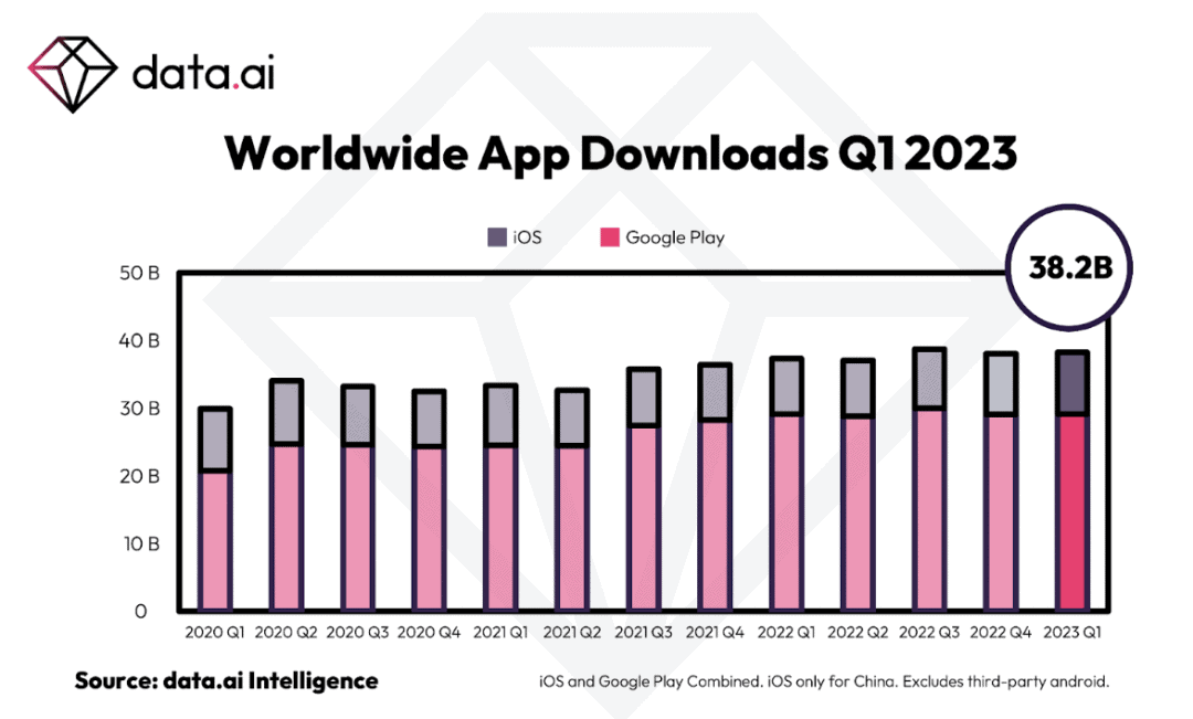 本季度顾客开销的增加伴跟着下载量的适度增加。整体而言,顾客在 2023 年第一季度下载了 382 亿次使用程序——仅次于2022 年第三季度的 387 亿次。(如下图)